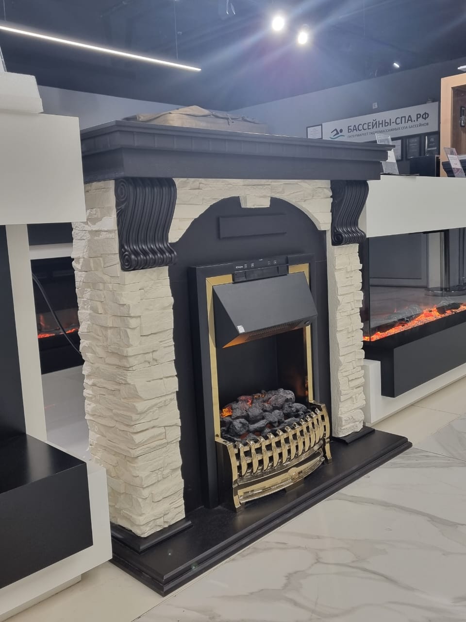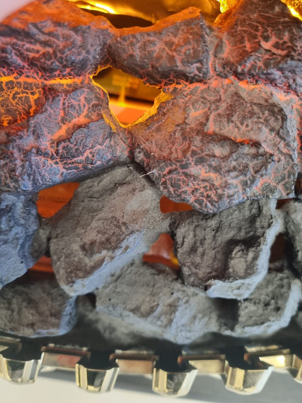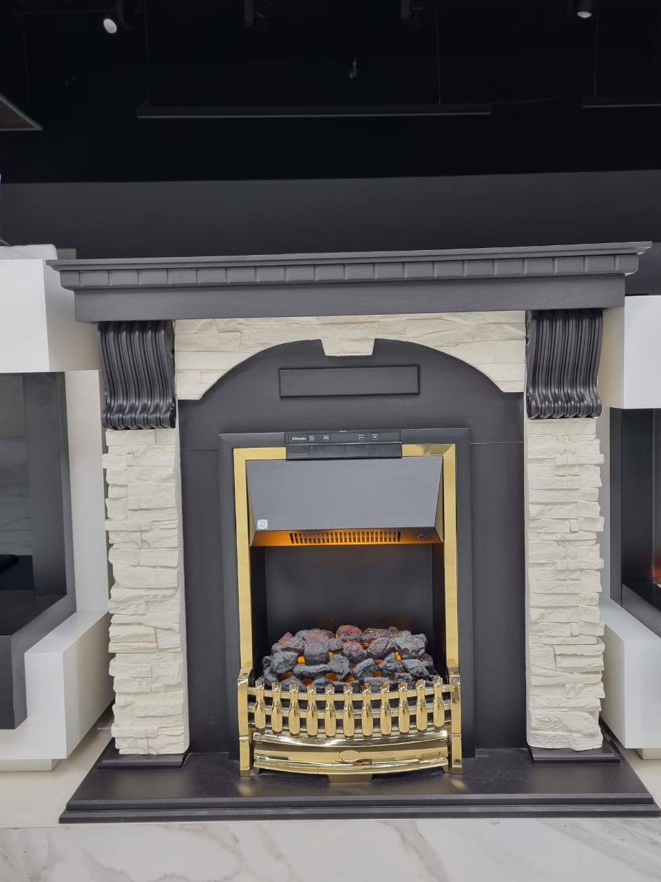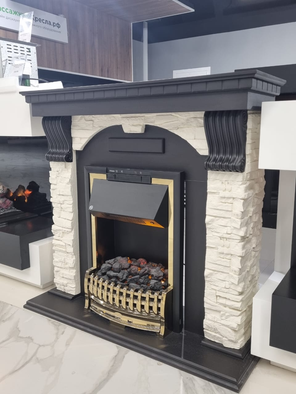 Вместо классических поленьев в очаге используется имитация  тлеющих углей.
